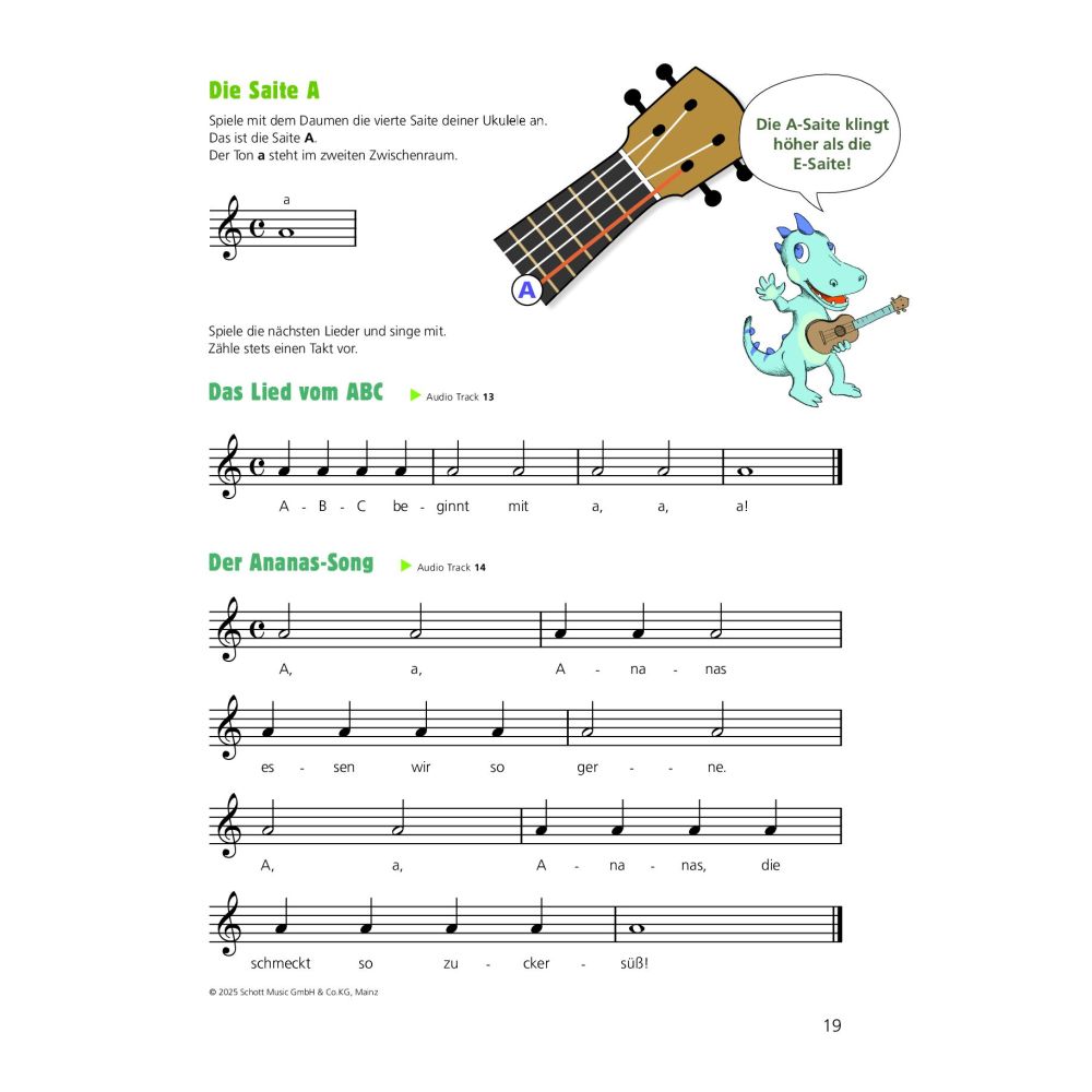 In diesem Buch lernen die sympathischen Dinosaurier Luna und Finn mit den Kindern gemeinsam Ukulele spielen. Wie den Kindern, so fällt auch den Dinos nicht alles leicht! Denn manchmal gibt es Probleme beim Spielen auf dem neuen Instrument - das ist ganz normal. Finn und Luna geben jedoch Tipps: Die Tipps stehen in Sprechblasen, die man besonders gut lesen kann. Man kann sie auch auswendig lernen. Zum Üben gibt es auch noch eine „Notenwerkstatt“ mit Schreib-Aufgaben. Und zum Abschluss winkt das „Dino-Ukulelen-Diplom“. Das kann man prima im Kinderzimmer aufhängen!