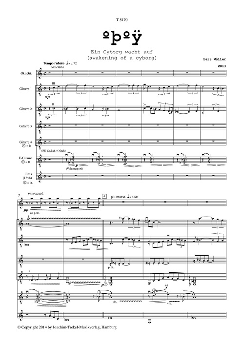 edition eurofestival präsentiert die vom "Bund Deutscher Zupfmusiker e.V." (BDZ) initiierten Auftragskompositionen für das "eurofestival zupfmusik 2014". Wie sehr sind wir mittlerweile verwachsen mit der digitalisierten Welt? Hat sich neben unserer Umwelt nicht auch schon unser Denken verändert? Und bekommen wir unsere schleichende Metamorphose überhaupt noch mit? Mit diesen Fragen habe ich mich in meiner Komposition °þ°ÿ - ein Cyborg wacht auf beschäftigt. Etwas hilflos stehen wir so auch vor dem Titel dieses Werkes. Er ist ein (unaussprechliches) chiffriertes Wort, dessen ursprüngliche Bedeutung hinter einem Algorithmus versteckt liegt. Algorithmen gestalten auch die Komposition selbst. So hab ich unter anderem das Prinzip des Binärcodes im Stück musikalisch verarbeitet. Der Code, der unser Leben unausweichlich bestimmt und zunehmend lenkt. Die E-Gitarre - der Cyborg unter den Gitarren - ist in diesem Stück kein Solo-Instrument sondern ist als integrierter Teil des Orchesters aufzufassen.
