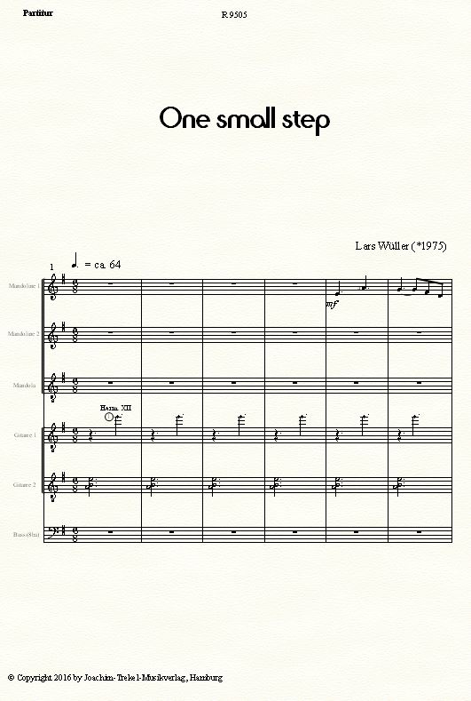 Der Titel „One small step“ ist ein Auszug aus dem berühmten Zitat von Neal Armstrong, als er als erster Mensch den Mond betrat: "Ein kleiner Schritt für einen Menschen, ein gewaltiger Sprung für die Menschheit". Die Komposition beschreibt die großartigen Auswirkungen, die ein kleiner mutiger Schritt in eine neue Richtung haben kann und wie er manchmal eine Reise voller Abenteuer in Gang setzt. The titel „One small step“ is an extract from the famous words of Neal Armstrong when he as the first human set foot to the ground of the moon: “That's one small step for a man, one giant leap for mankind.ö This composition describes the wonderful impact that one brave step into a new direction can have and how it sometimes launches a journey full of adventures.